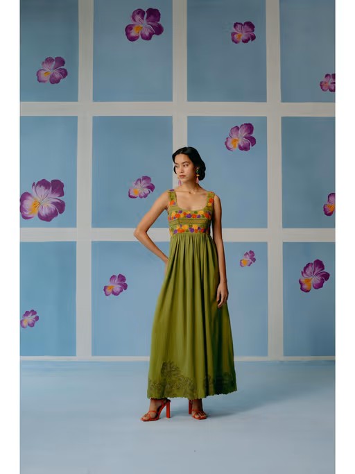 Olive Green Scoop Neck Gathered Dress With Texture Embroidery On Yoke And Lace Applique On Bottom Flare. Fit: Regular Fit. Garment Length: 55" Inches model Info: Height: 5 Ft. 7 In. | Wearing Size Swash Care: Cold Water/Hand Wash