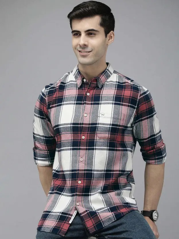 Men Slim Fit Checkered Button Down Collar Casual Shirt