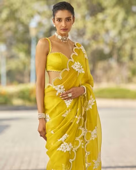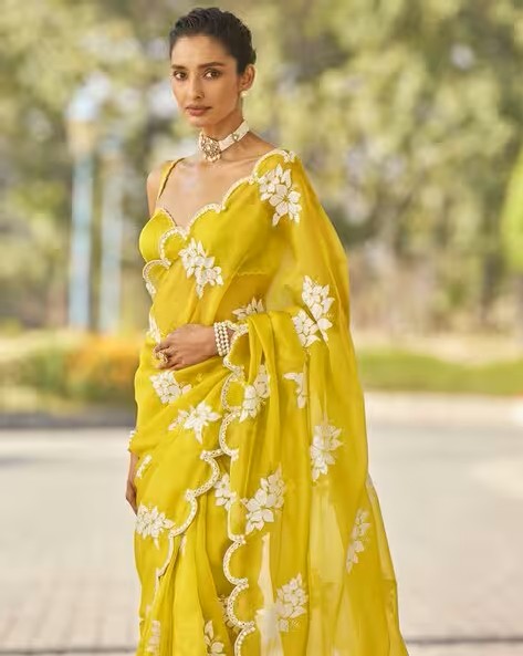 The last image gives a detailed look of the blouse piece that comes with this saree (The blouse in the images is only for styling purpose)