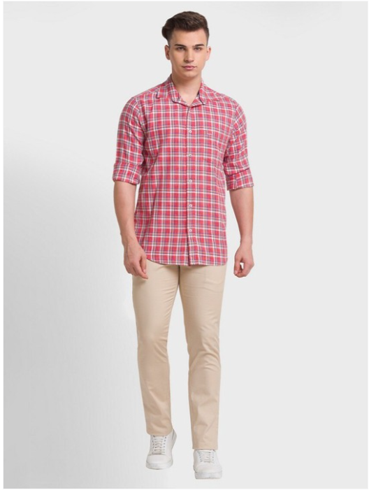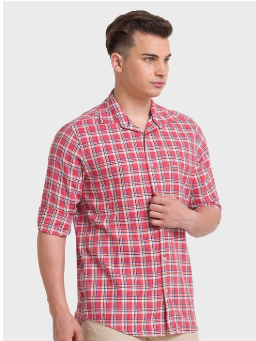Red tartan checked opaque Casual shirt ,has a spread collar, button placket, 1 patch pocket, long regular sleeves, curved hem