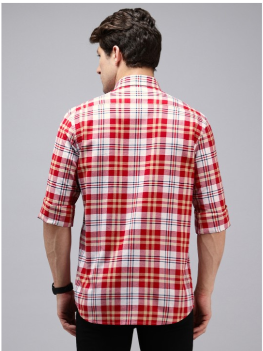 Red and white checked opaque Casual shirt ,has a spread collar, button placket, 1 patch pocket, long regular sleeves, curved hem