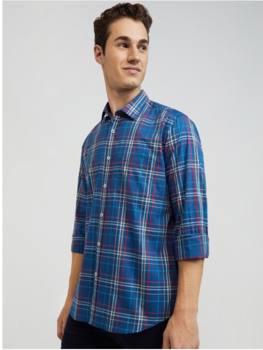 Blue tartan checks checked opaque Casual shirt ,has a spread collar, button placket, 1 patch pocket, long regular sleeves, curved hem