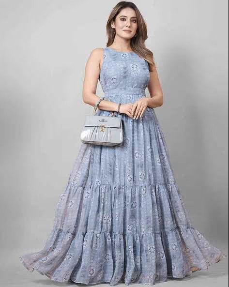 Fabric: Premium quality georgette for a breathable and soft feel. Design: Fit & flare silhouette with tiered hem for volume. Style: Flowy maxi dress ideal for casual to semi-formal occasions. Length: Floor length for a graceful, princess-like vibe. rendy Pastel Print – Contemporary look perfect for day events & festive wear