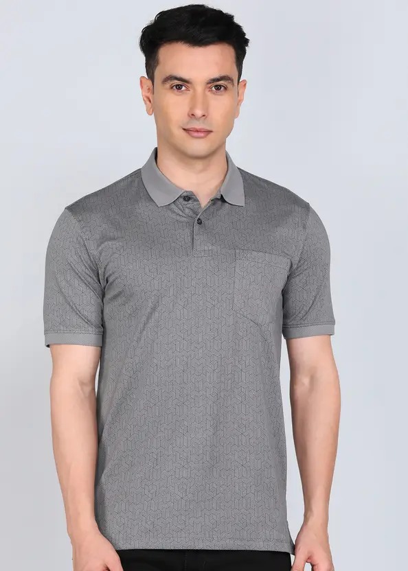 Men Printed Polo Neck Organic Cotton Silver T-Shirt