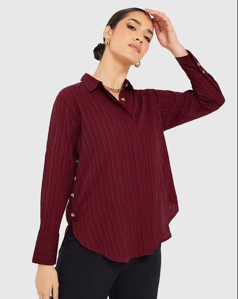 Women High-Low Hem Button Detail Crepe Shirt