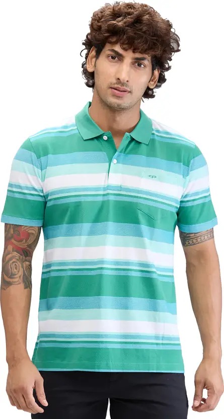 Men Striped Polo Neck Pure Cotton Green T-Shirt