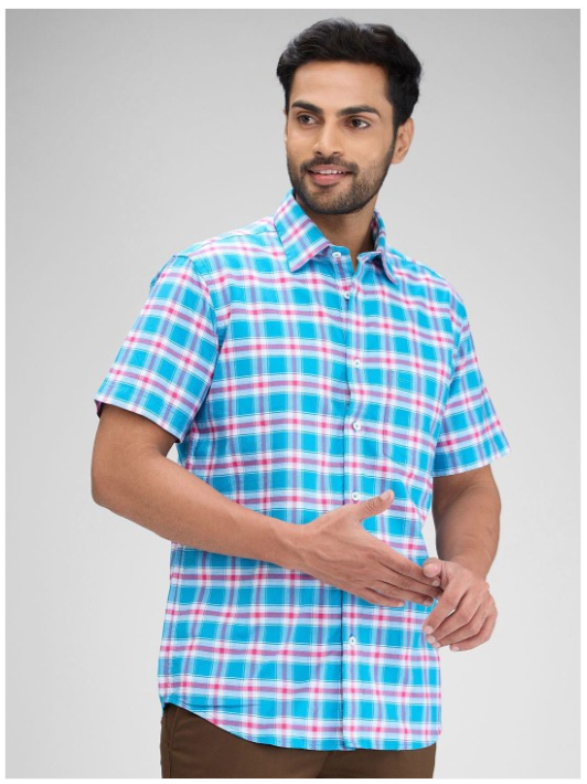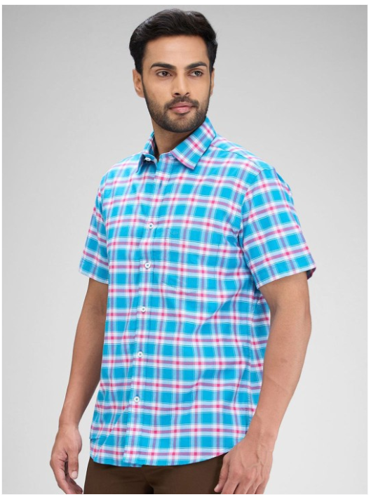 Blue tartan checks checked opaque Casual shirt ,has a spread collar, button placket, na pocket, short regular sleeves, curved hem