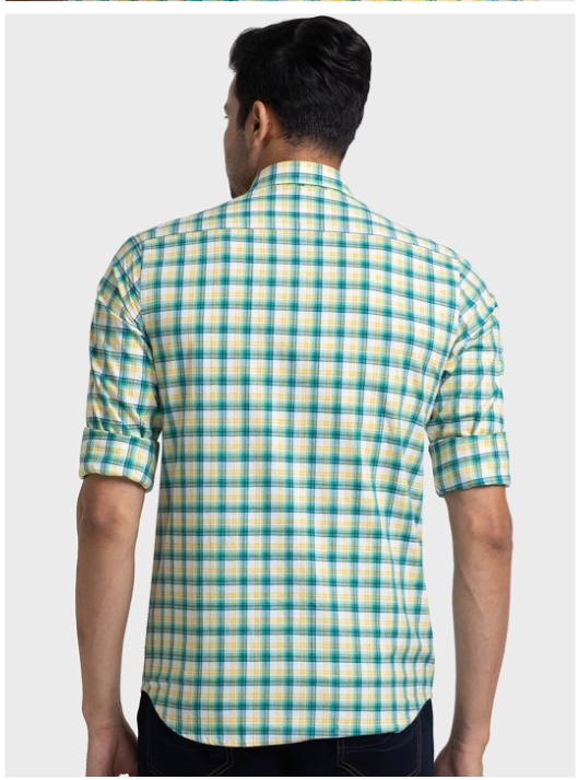Green, yellow & white other checked casual shirt, has a spread collar, button placket, 1 patch pocket, long regular sleeves, curved hem