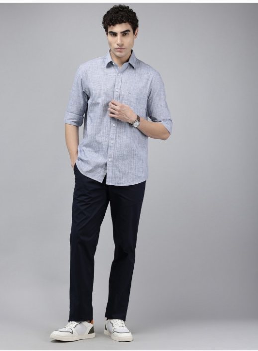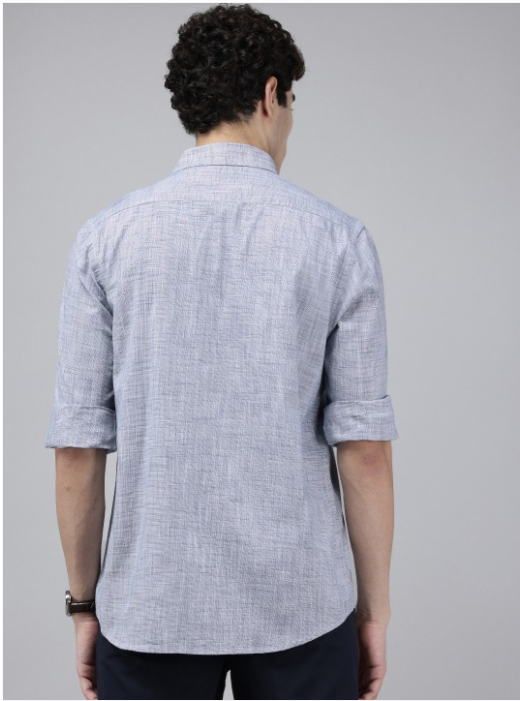 Blue textured self design opaque casual shirt, has a spread collar, button placket, 1 patch pocket, long regular sleeves, curved hem