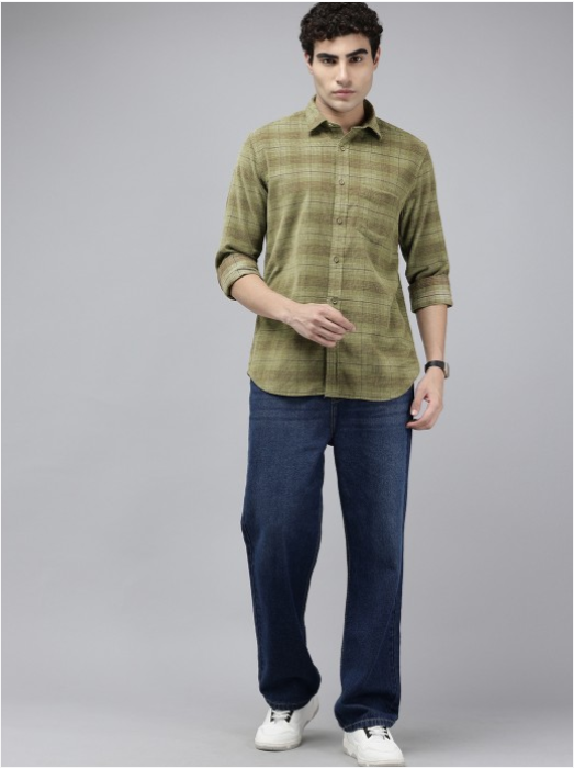 Green other checks opaque casual shirt ,has a spread collar, button placket, 1 patch pocket, long regular sleeves, curved hem