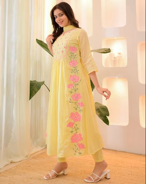 Brighten up your festive look with this Baby Blue kurta set featuring elegant pink floral embroidery Crafted in soft fabric with a flared silhouette, it’s perfect for daytime functions and casual celebrations.