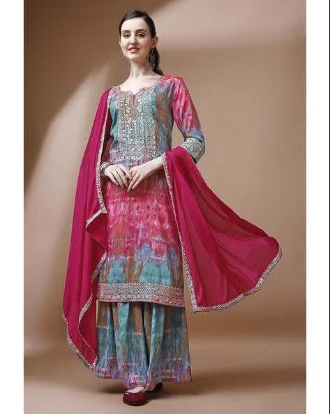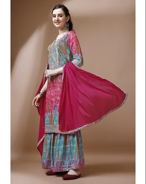 Package contains: 1 kurta, 1 sharara, 1 dupatta