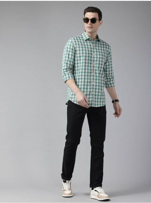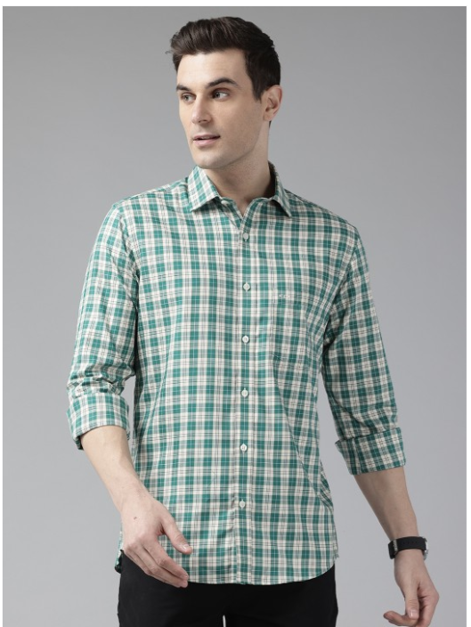 Brown & blue checked opaque casual shirt, has spread collar, button placket, long regular sleeves, 1 patch pocket, curved hem