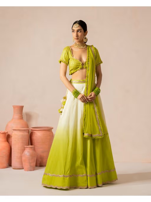 Indulge in elegance with this green lehenga set from Goldys Nestt. Made from high-quality cotton, the choli features half sleeves, a sweetheart neckline, tie-ups closure, and a ombre pattern, finished with a mid-waisted lehenga and a stylish dupatta. Style it with minimal jewellery and sandals to complete the ensemble.