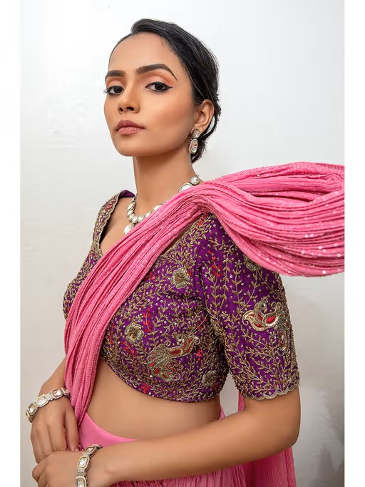 Dress up in elegant way with this purple lehenga, blouse from Daatri by meenakshi kakkar. Made from high quality georgette silk, it features hook and eye closure and embroidered pattern along with half sleeves & v-neck design. Pair it with sneakers to complete your ensemble.