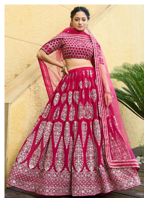 Step into elegance with this stunning Cherry Red Zari Embroidered Faux Georgette Lehenga Set, designed to turn heads at every celebration. A beautiful blend of tradition and trend, it's your perfect pick for any grand event.
