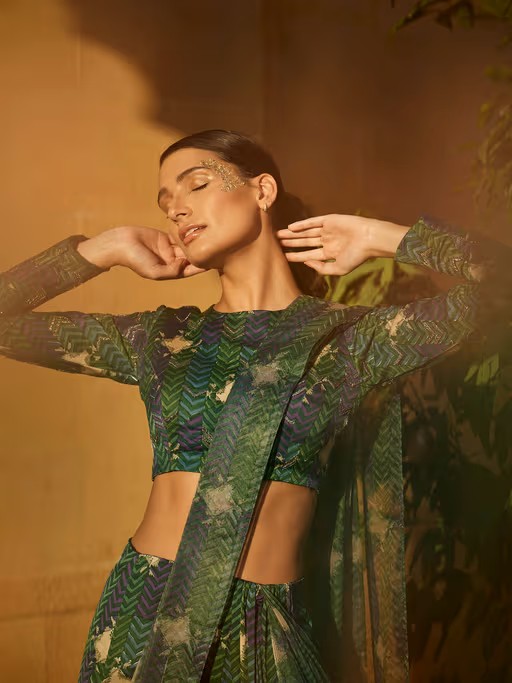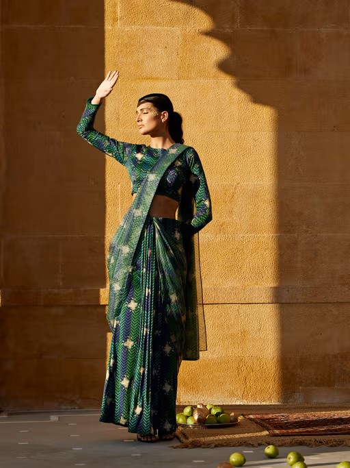 Green Pre-Draped Saree with Stitched Blouse