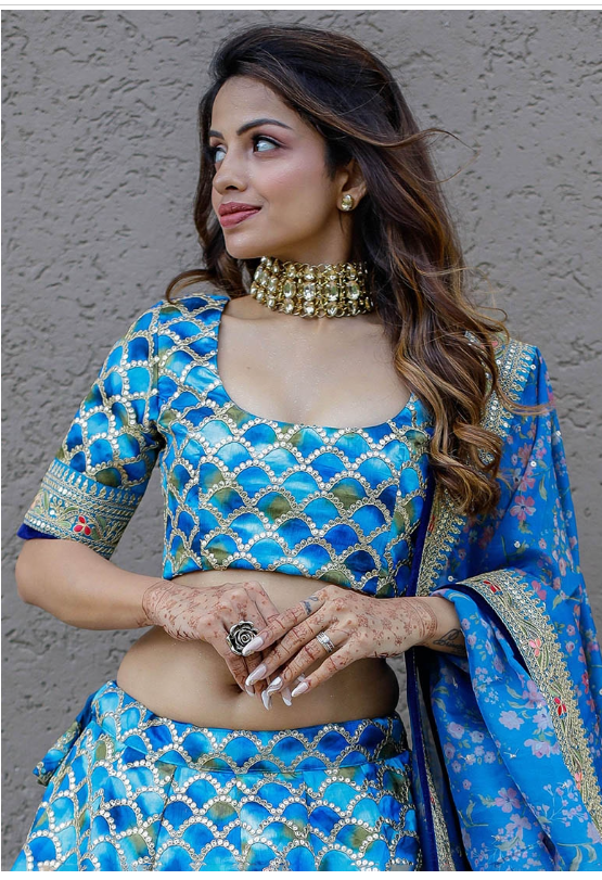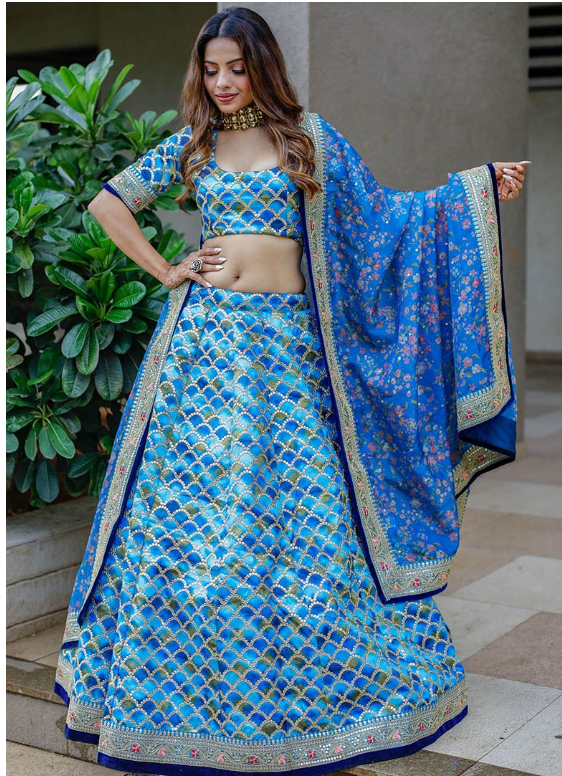 Make a graceful statement in this Blue Sequin Embroidered Art Silk Lehenga Set, featuring intricate embroidery on luxurious silk. Ideal for special occasions, this elegant ensemble combines timeless design with rich texture for a truly regal look.