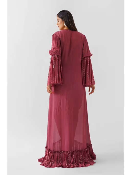 Adorn the styles specially made for you with this mauve set from Suruchi Parakh. Made from high quality georgette, it features pull on closure and embroidered pattern along with sleeveless & shoulder straps design. Pair it with trendy footwear to elevate your look.