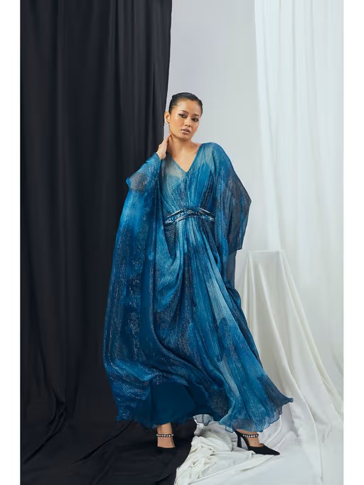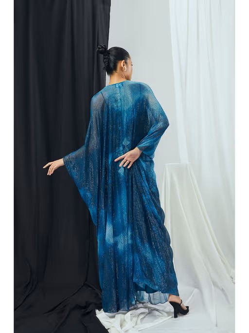 Experience comfort in style with this blue kaftan set from Nirmooha. Made from high-quality cotton lurex, the kaftan dress features flared sleeves, a v-neck and a printed pattern. It is paired with a comfortable slip. Style it with minimal jewellery and sandals to complete the ensemble.