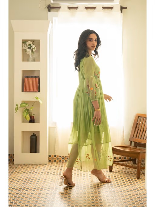 This Handcrafted Chander Dress Is A Graceful Blend Of Textures And Intricate Details. Featuring A Yoke Cut With Organza Accents, It Showcases Botanical Flower Motifs Intricately Embroidered With Anchor, Silk Threads, Zari, And Delicate Beads. The Puff Sleeves And V-Neck Add A Timeless Charm, While The Anti-Fit Silhouette Ensures Effortless Wear. Finished With Embroidery On The Yoke, Sleeves, And Bottom Hem, And A Discreet Side Zipper For Closure, This Dress Exudes Understated Artistry. Fabric - Chandrakala - Green Dress Length- 50"Sleeve Length - 19.5"Neck Depth - 8"Model Is 5'8" And Is Wearing Size Small. Please Reach Out To Us For Any Customisation.