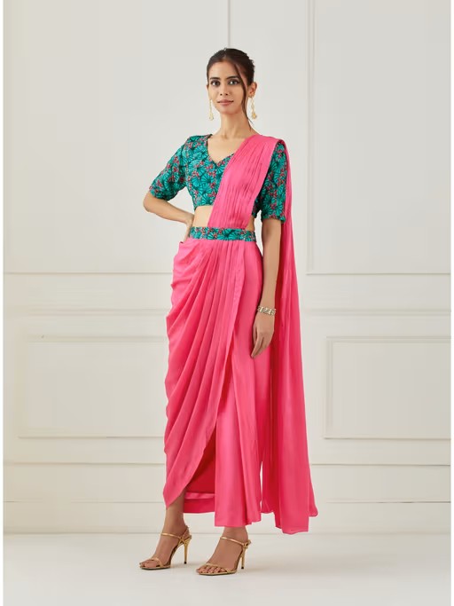 Pink Draped Saree with Sleeves Saree with Stitched Blouse