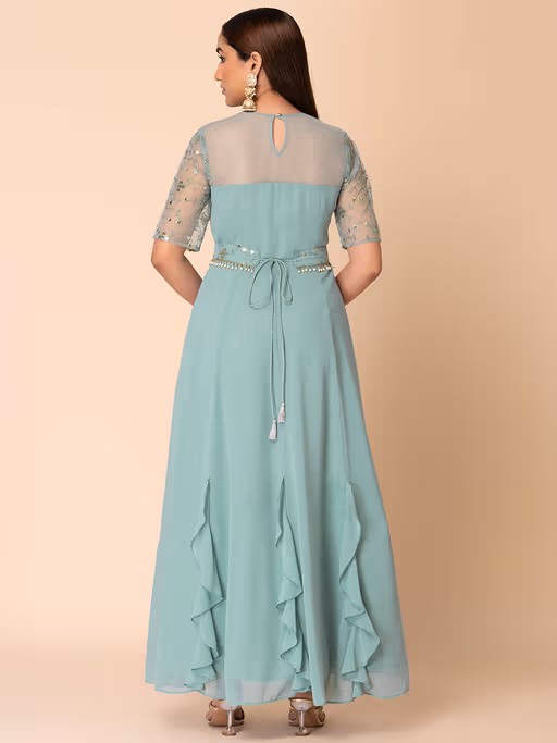 Elevate your look by stepping out in this captivating pastel green sequin embroidered anarkali dress with embroidered belt from Indya. Made from high-quality georgette, this piece features half sleeves and a round neck. Style it with minimal jewellery and sandals to complete the ensemble.