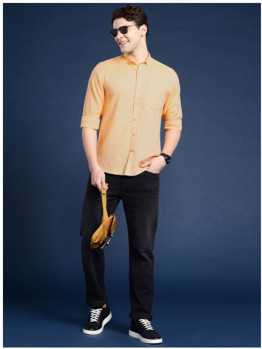 Orange solid opaque Casual shirt ,has a button-down collar, button placket, 1 patch pocket, long regular sleeves, curved hem