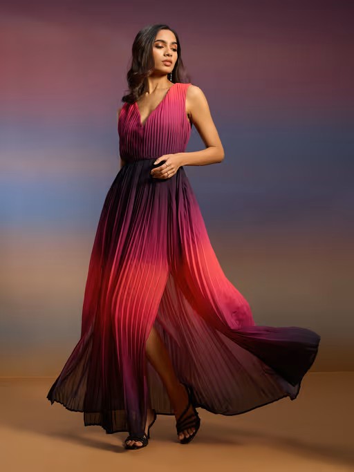 Style Note: The ombre pattern will bring in a charming touch to your party collection. Style it with rose gold heels, a clutch and hoops to go club hopping with your group - says our inhouse stylist Shimoli Kapasi.