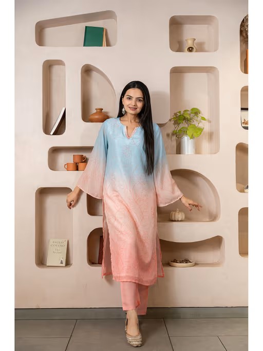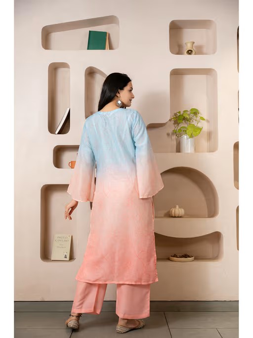 This is a Two piece Co-Ord setFit- Regular fitColor- Blue & peachKurta set Fabric- MuslinPack of 2Pattern- PrintedNeck Type- Round with V shapeSleeve- Flare sleeveDesign Details- A Ombre blue to pink all over printed kurta with round with V shape neck line finished with lace. Flare sleeve & Straight kurta with straight pant style co-rods set. Set Contents- Kurta & Pants Wash Care Details- Hand Wash OnlyModel Details- Model is wearing S sizeDisclaimer- Slight colour variations may occur due to screen Settings