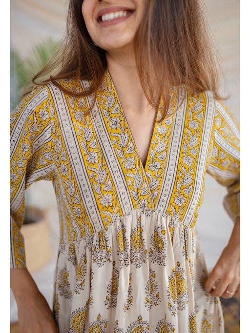 Capture subtle beauty in this Anaisha Bagru Cotton Dress, featuring an intricate bagru print that's perfect for summer days. Crafted from premium cotton, this dress features 3/4th sleeves, a V-neck, and a flared silhouette for a flattering look. Ideal for dressy occasions, this dress offers a timeless sophistication to any wardrobe.