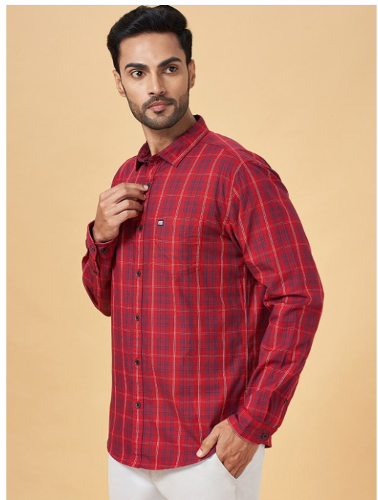 Red & navy blue checked opaque casual shirt ,has a spread collar, button placket, 1 pocket, long roll-up sleeves, curved hem