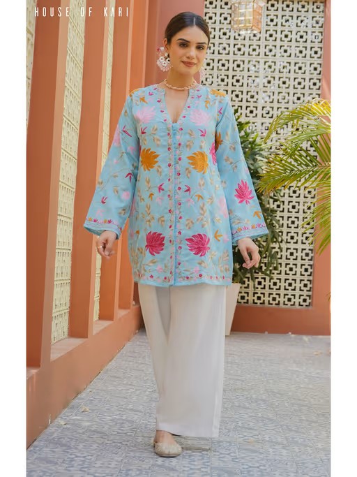 Make a style statement in this blue kurti from HOUSE OF KARI. Crafted from cotton, this stylish kurti features full sleeves and a mandarin neck. Team it with a pair of trousers, heels, and stud earrings.