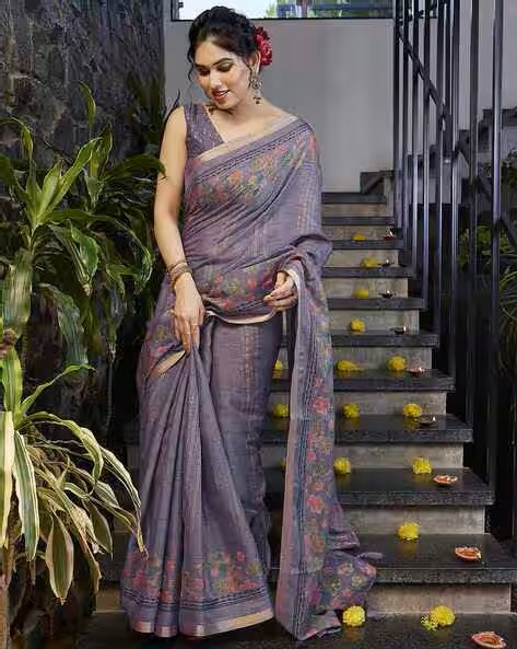 Floral Print Saree with Contrast Border