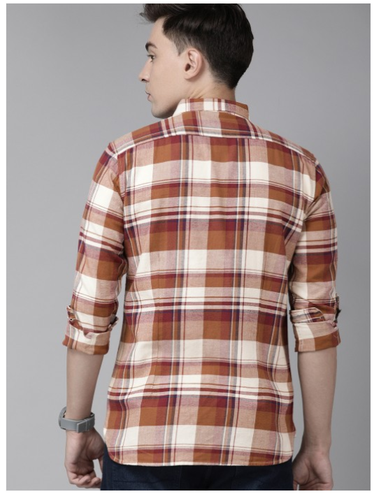 Rust orange and white tartan checks checked opaque Casual shirt ,has a button-down collar, button placket, 1 patch pocket, long regular sleeves, curved hem