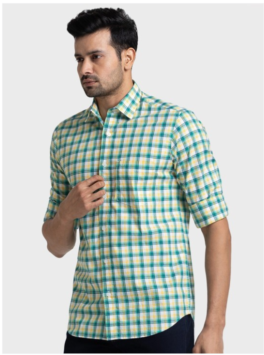 Green, yellow & white other checked casual shirt, has a spread collar, button placket, 1 patch pocket, long regular sleeves, curved hem