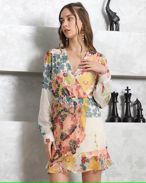 Shein Full Cuffed Sleeve Floral Print Mock Wrap A-line Dress