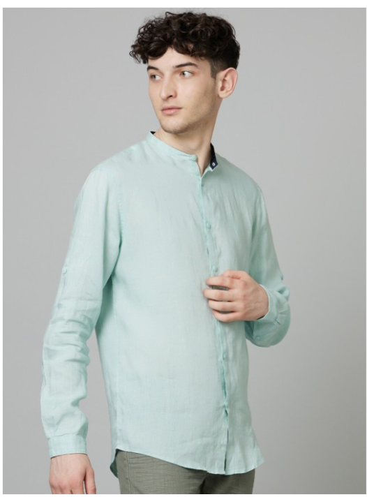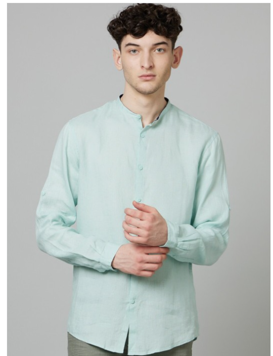 Green solid opaque Casual shirt ,has a spread collar, button placket, long roll-up sleeves, straight hem