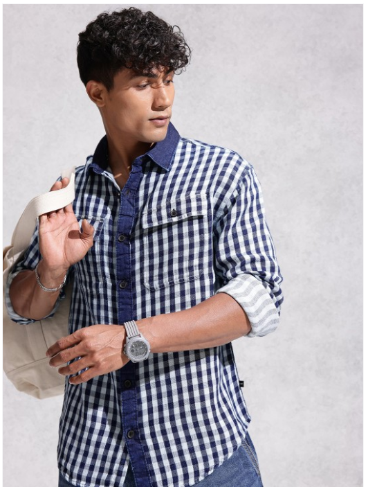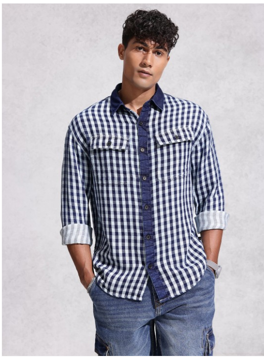Navy blue gingham checks opaque casual shirt, has a spread collar, button placket, 2 flap pocket, long drop-shoulder sleeves, curved hem